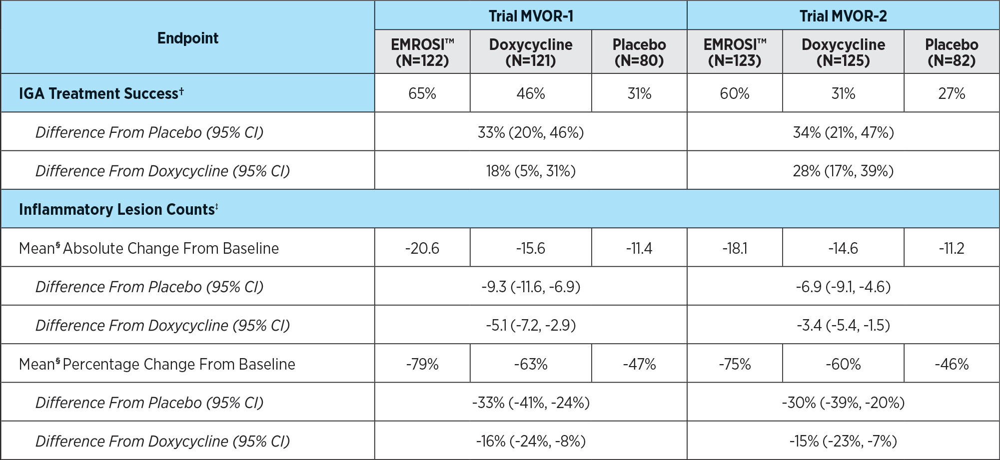 Study design: Two identically designed, randomized, double-blind, active- and placebo-controlled Phase 3 trials (MVOR-1 and MVOR-2), including 653 total participants, to compare the impact of oral EMROSI™ (minocycline HCl 40 mg capsules), Oracea® (doxycycline, 40 mg), and placebo in adults with moderate-to-severe rosacea.1